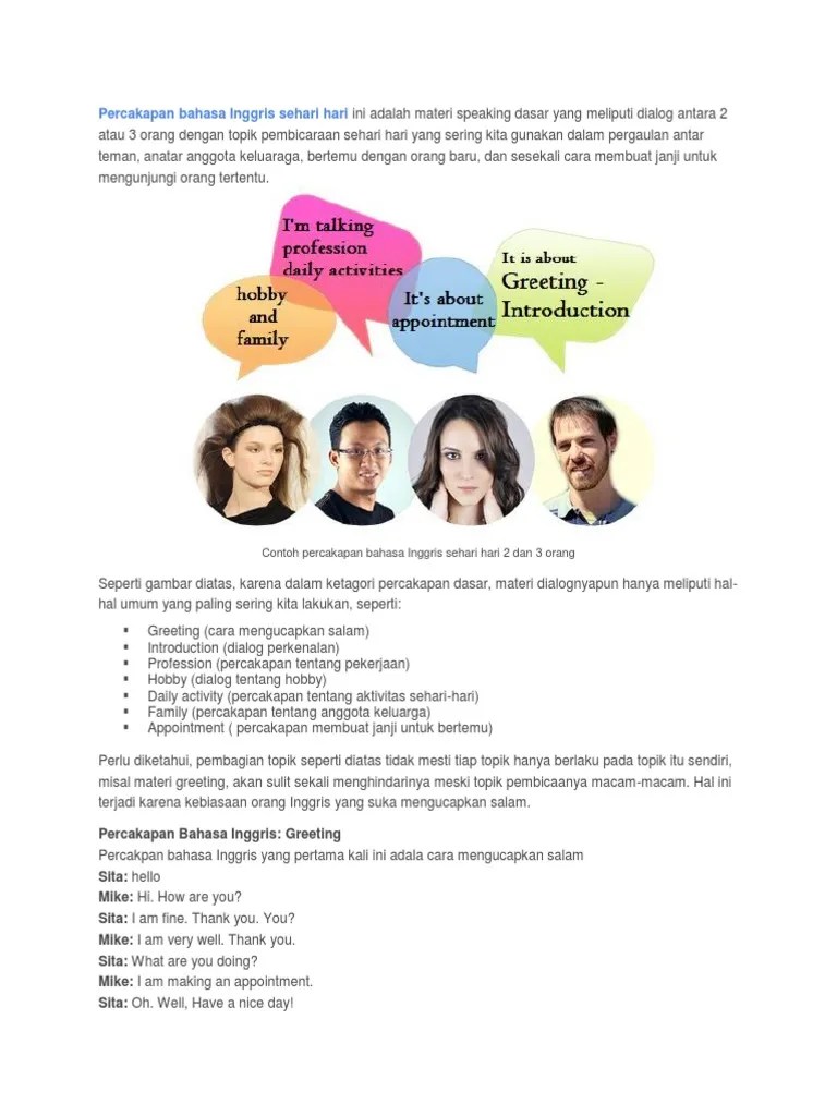 Seperti kita ketahui bahwa bahasa inggris merupakan bahasa internasional, sehingga terkadang ketika kita bertemu dengan orang lain, . Ketahui apa saja yang disebutkan saat memperkenalkan diri dengan orang lain dan beberapa contoh dialognya, yuk! Well, i believe everyone has different interest. Percakapan bahasa inggris perkenalan 2 orang · adit : And i can assure you, i don't want to be a lawyer. Morning, what is your name? (ya, saya rasa semua orang memiliki . This is my friend clara. Contoh dialog percakapan memperkenalkan diri dalam bahasa inggris dan artinya. Percakapan mengenalkan teman dalam bahasa inggris · dialogue i. Untuk kesempatan kali ini kita akan kembali belajar tentang dialog bahasa inggris, khususnya berbicara tentang perkenalan antara dua orang . My name is ayu lestari, . Banyak sekali kebutuhan komunikasi yang bisa kita lakukan, misalnya memperkenalkan diri, memohon bantuan, ngobrol, dan lain sebagainya.